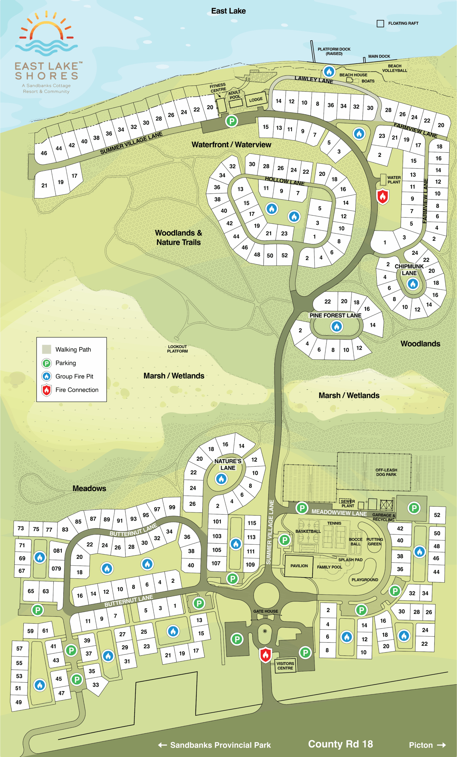 Perfect for younger families, these cottages are conveniently located near the Pavilion, Welcome Centre, family pool, sports courts, and our fenced-in dog park. Most have access to community fire pits and offer plenty of space for outdoor fun in the sun.
